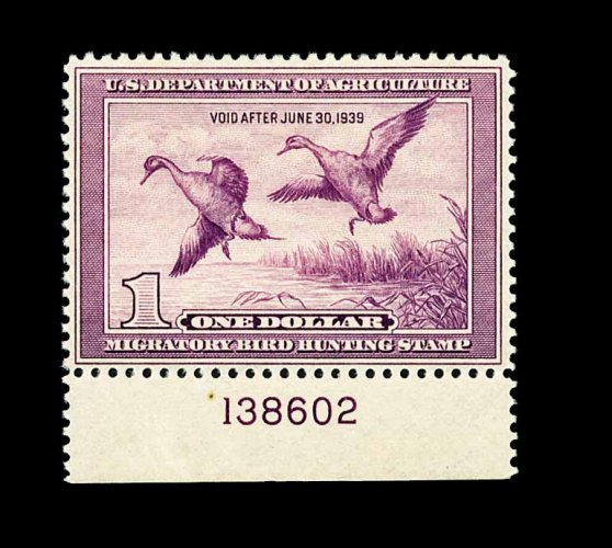 769 nh RW5 image#RW5, 1938 $1.00 Light violet, bottom sheet-margin plate no. 138602 single, especially well centered, rich color, o.g., n.h., extremely fine; 2001 PF certificate. (Image) 400.00