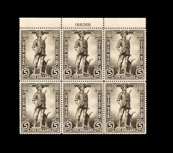 777 nhX S5 image#S5, $5.00 Sepia saving stamp, top margin plate no. 166068 block of six, incredibly well centered throughout, fresh and intact, o.g., n.h., extremely fine; a gem example of this surprisingly scarce plate block. (Image) 725.00