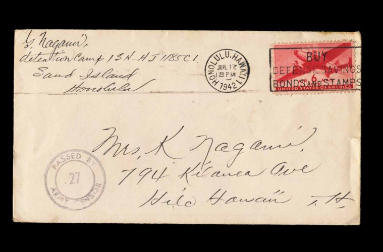 780 c imageWorld War II Internee correspondence to/from Hawaii, a total of 46 covers from a Japanese-American family living in Hawaii, the father being interned on Sand Island, Hawaii in the summer of 1942 and then was transferred to the mainland in 1943, most of the covers (34) are the father or other interned family members writing to the mother from various camps including nine from the scarcer Sand Island camp, also Santa Fe (10), Lordsburg (8), Rivers (3), Angel Island, Denson, Newell and Manzanar (1 each), as well as two covers sent to Sand Island but returned to sender, the original letters (in Japanese) also accompany, several of which have translations, some of the letters are on official "Internee of War" envelopes (a few are on "Prisoner of War" envelopes but have "Prisoner" crossed out and "Internee" inserted by hand); ironically, their son was drafted into the army (and killed in action in Italy), and some of his correspondence is also present, including one on a Mutual Telephone Co. illustrated cover, covers in mixed condition as expected on censored mail; a fascinating look into the internee mail system during WWII, and especially interesting with the Hawaii connection. (Image) Est. 400-500