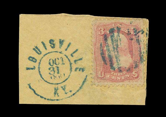 68 O 64a image#64a, 3c Pigeon blood pink, an exceptional quality example of one of the rarest shades in all of 19th century U.S. philately, and certainly one of philately's most unique color identifications, possessing extraordinarily large and well balanced margins, striking rich shade with the obvious bluish undertones that are essential to correctly identify this as a Pigeon blood pink, neatly tied to piece by a Louisville, Ky. blue duplex postmark, extremely fine; one of the choicest and largest-margined used examples to be offered on the auction market in quite some time; 1976 and 1991 PF certificates for a cover from which this piece was cut out. (Image) 3,500.00