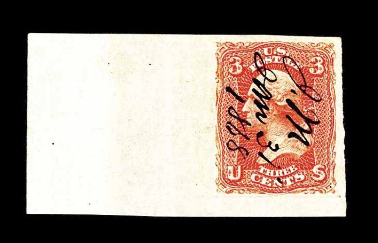 75 O 74a image#74a, 3c Scarlet, imperforate, a striking bottom left corner sheet-margin example, with huge sheet margins and the other margins being quite large, stamp with central manuscript "J.M./ Jan. 31/ 1868" in three lines, thought by students of this rarity to be in the hand of James Macdonough, one of the founders of the National Bank Note Company, with color, impression and paper exactly as found on the existing perforated examples of this trial printing, some creasing of little importance considering the near unique nature of this remarkable imperforate, extremely fine appearance; one of only three recorded Three Cent Scarlets with the manuscript initials and date, one of which is perforated, the other two being imperforate; 1999 PF certificate. (Image) Est. 5,000-7,500