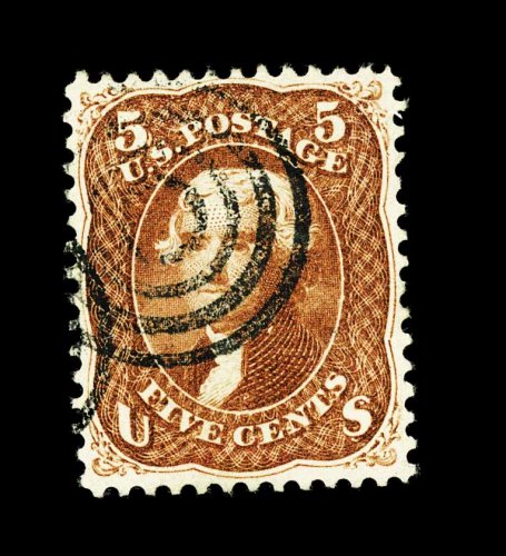 76 O 75 image#75, 5c Red brown, a gorgeous used example that possesses spectacularly rich luxuriant color and a vivid impression, incredibly well centered as well, especially for this notoriously difficult value, neat black and red cancels at bottom, extremely fine; an eye-catching used gem; 1991 and 2002 PF certificates. (Image) 485.00