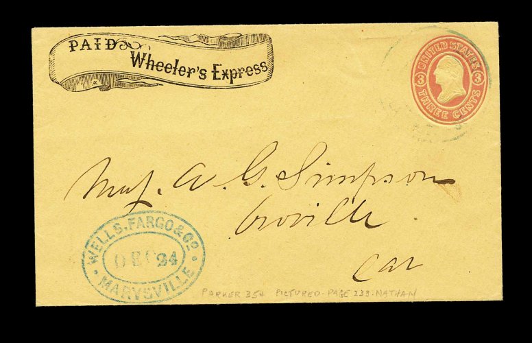 841 c imageWheeler's Express/Paid. black printed scroll frank on 3c Pink on buff entire (#U35) to Oroville, Cal., indistinct double ring blue handstamp cancelling indicia, conjunctive usage with "Wells, Fargo & Co./Dec 24/Marysville" blue double oval handstamp at bottom left, fabulously fresh and clean, very fine and exceedingly choice; this small line operated from Marysville, Cal. to the Feather River and Gibsonville Range camps; illustrated in Nathan; ex-Parker. (Image) Est. 300-400