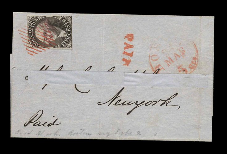 842 c 9X1 image#9X1, New York, N.Y. 5c Black Postmaster Provisional, signed ACM connected, pos. 14, ample to large margins all around, tied by sharp red strike of New York square grid applied on arrival, with matching "Paid" in arc, red "Boston 5cts/Mar 5" c.d.s., address name cut out as often with the Howland & Aspinwall correspondence, very fine; a very scarce used of the New York provisional from Boston to New York. (Image) Est. 1,000-1,500