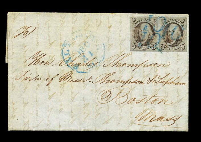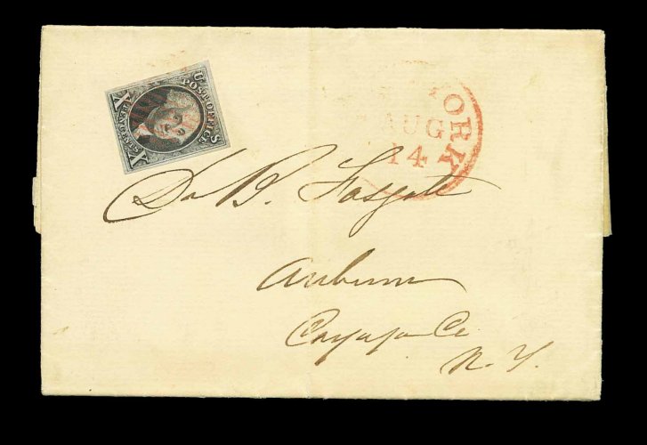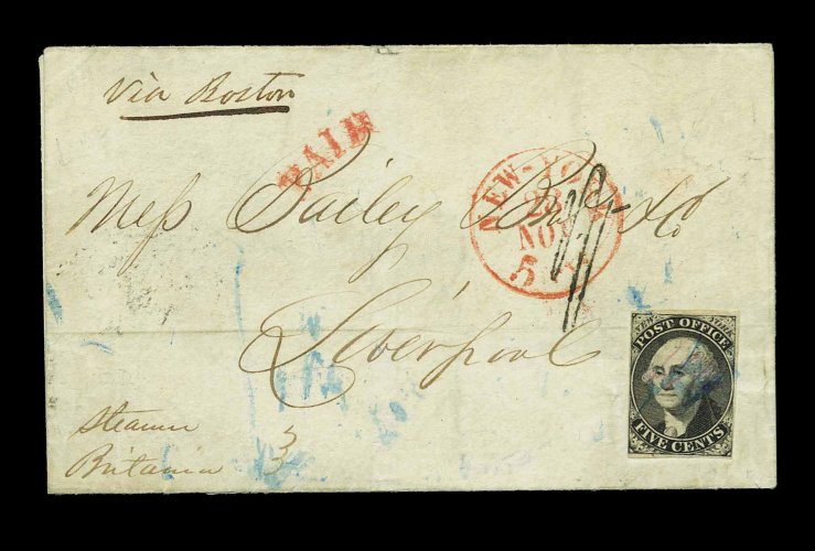 843 c 9X1a image#9X1a, New York, N.Y. 5c Black Postmaster Provisional, signed AC" connected, three large margins, close but clearing at left, tied by blue pen strokes on 1845 folded lettersheet to Liverpool, England, crisp strike of red "New-York 5cts/23 Nov" c.d.s. and matching "Paid", ms. "Via Boston" and "Steamer Britannia", "1/-" due marking, "America Liverpool De. 16, 1845" backstamp, light file fold just faintly affects stamp, still a very fine transatlantic usage; ex-Hubbard. (Image) 2,250.00