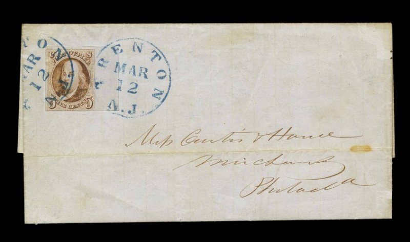 844 c 1 image#1, 5c Red brown, enormous margins including a sizable sheet margin at right, closer but clear at bottom, rich luxuriant color and impression, superbly tied to blue 1850 folded letter by two strikes of "Trenton, N.J./Mar. 12" c.d.s., addressed to Philadelphia, very fine; a choice and eye-arresting usage of an 1847 Issue from New Jersey, franked with an impressive sheet margin copy; ex-Arch. (Image) Est. 2,000-3,000