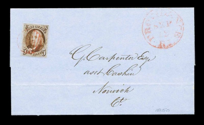 845 c 1 image#1, 5c Red brown, gorgeous four margined example, featuring large well balanced margins all around, plus its color is wonderfully rich and its impression extraordinarily detailed from a cleaned plate, tied to an immaculate blue folded entire to Norwich, Conn. by a red grid cancel, matching "Providence, R.I./Sep 19" c.d.s. at right, extremely fine; a gem Five Cent 1847 stamp on a beautiful cover; ex-Emerson, Chase and Ackerman. (Image) Est. 1,000-1,500