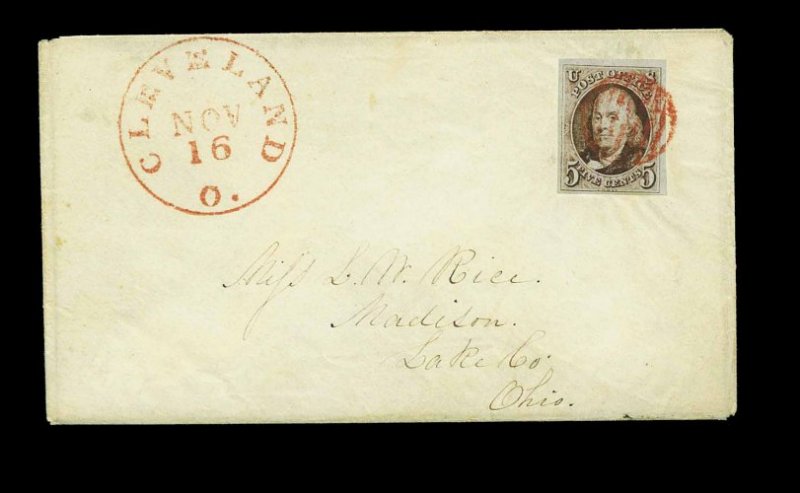 846 c 1 image#1, 5c Red brown, four full to large margins, deep luxuriant color and an especially strong impression, tied to petite cover to Madison, Ohio by red grid, matching clearly struck "Cleveland, O./Nov. 16", with original enclosure, extremely fine; a wonderfully choice cover; ex-Newbury. (Image) Est. 750-1,000
