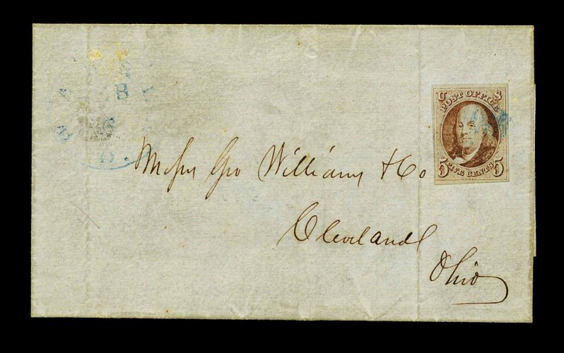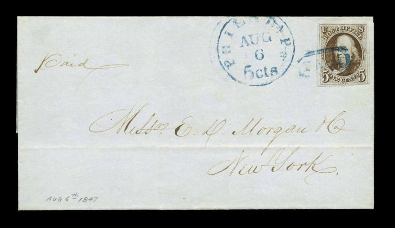 847 c 1a image#1a, 5c Dark brown, lovely intense shade and deep rich color, ample to mostly large margins, tied to 1847 folded entire to New York by blue "Paid" in frame, matching "Philada., Pa./Aug 6/ 5 cts" integral rate c.d.s., very fine; a choice early usage of the Dark Brown shade. (Image) Est. 1,000-1,500