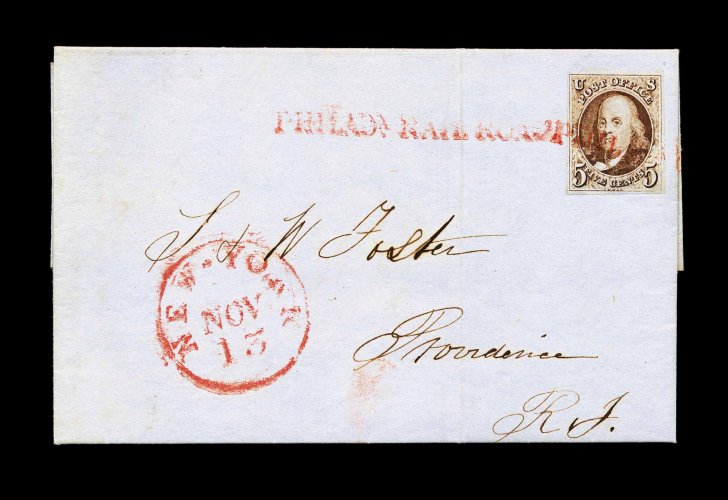 848 c 1 image#1, 5c Red brown, uniformly large margins, rich color and a clean impression, wonderfully tied to an 1849 blue folded letter to Providence, R.I. by red straightline "Philada. Rail Road" handstamp, matching red "New-York/Nov 13" c.d.s., extremely fine; one of the finest quality examples of a Philadelphia Railroad usage of a Five Cent 1847 Issue we have ever seen. (Image) Est. 1,500-2,000