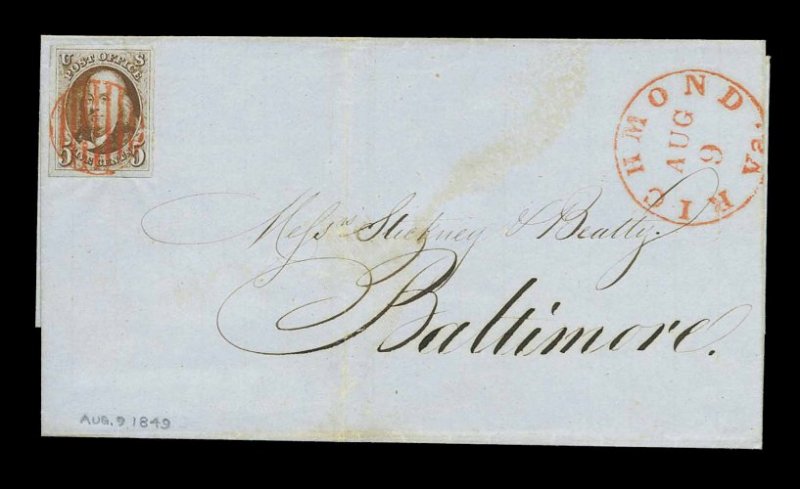 849 c 1 image#1, 5c Red brown, four exceptionally large and wonderfully balanced margins, rich luxuriant color and a finely detailed impression, tied to a blue 1849 folded entire to Baltimore, by vivid red grid, matching "Richmond, Va./Aug. 9" c.d.s., extremely fine; an exceedingly choice cover; ex-Ackerman. (Image) Est. 1,000-1,500