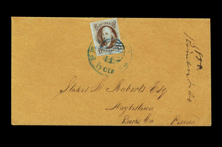 850 c 1 image#1, 5c Red brown, a lovely single with large margins all around, the color is vibrant and the impression extremely crisp, this gem is tied to an immaculate brown cover by both a bold blue grid cancel and matching "Philada Pa./Jul 11/ 5 cts" integral rate c.d.s., the enclosure and docketing at right place this cover in the mails in 1850, sent to Doylestown, Penna., extremely fine; an extraordinarily beautiful cover made the more interesting by the combination of cancels tying the stamp; ex-Boker. (Image) Est. 1,000-1,500