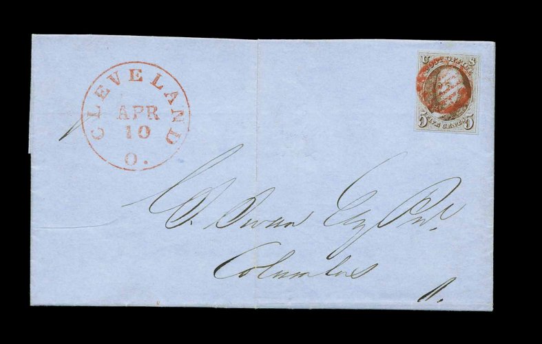 851 c 1 image#1, 5c Brown, four uniformly large margins, bright color and distinctive late impression, just tied to immaculate blue 1850 folded letter to Columbus, Ohio by red grid, matching "Cleveland, O./Apr. 10" c.d.s. wonderfully well struck at left, extremely fine and handsome; 1978 PF certificate. (Image) Est. 750-1,000