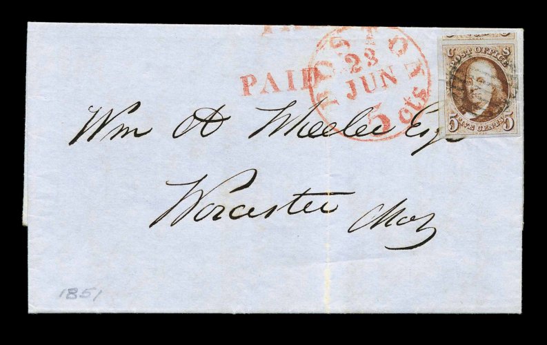 852 c 1 image#1, 5c Red brown, striking example boasting huge margins all around, including a significant portion of the adjoining stamp at top, lovely rich color and impression, cancelled by a scarce neat black grid and used on 1851 folded letter to Worcester, Mass., red "Boston/23 Jun/5 cts" integral rate c.d.s. and matching "Paid" alongside, extremely fine; a highly select very late usage of the Five Cent 1847 Issue, which was demonetized just seven days later. (Image) Est. 1,500-2,000