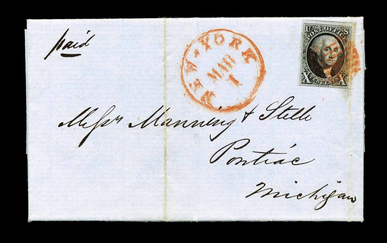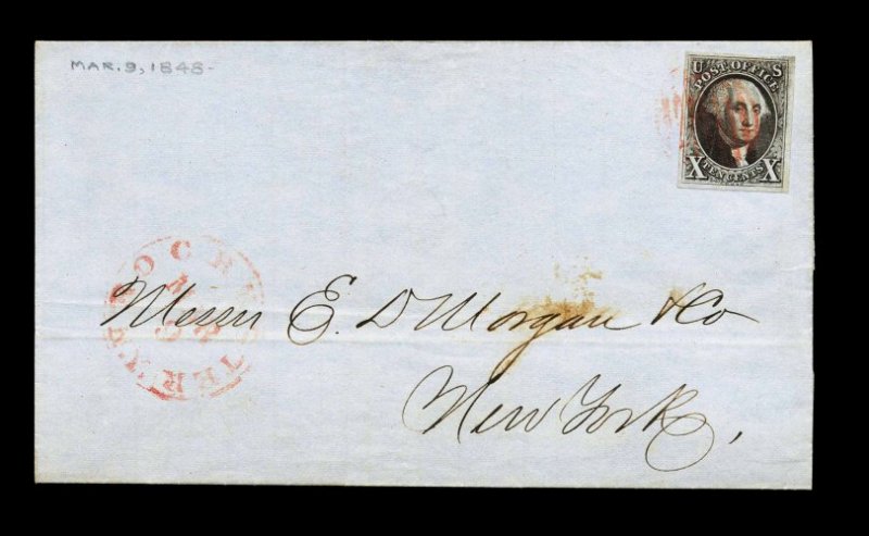 855 c 2 image#2, 10c Black, four large and symmetrical margins, strikingly intense color and impression, tied to neat blue 1848 folded entire to New York City by red grid, matching "Rochester, N.Y./Mar. 9" c.d.s. at left, extremely fine; a handsome cover franked with a particularly choice stamp. (Image) Est. 1,500-2,000