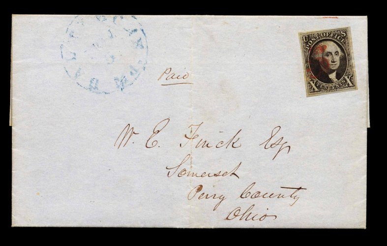 856 c 2 image#2, 10c Black, choice single with four large margins and deep luxuriant color, cancelled solely by a red "5" numeral on an 1848 folded letter to Somerset, Ohio, blue "Baltimore, Md./Nov. 5" c.d.s., extremely fine; a choice example of a cover where the stamp was cancelled by a numeral postmark, used not as an indication of the rate paid, but purely as a cancelling device. (Image) Est. 1,500-2,000