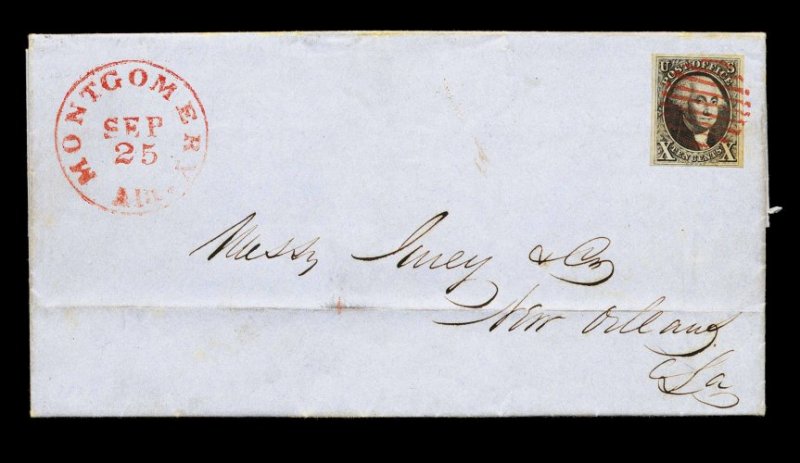 858 c 2 image#2, 10c Black, exceptional early impression, four ample to mostly large margins, superbly tied to an 1849 blue folded letter (with printed banking letterhead) by red nine bar unframed circular grid, lovely matching "Montgomery, Ala./Sep 25" c.d.s. at left, addressed to New Orleans, very fine; a particularly attractive and scarce cover; ex-Boker. (Image) Est. 1,500-2,000