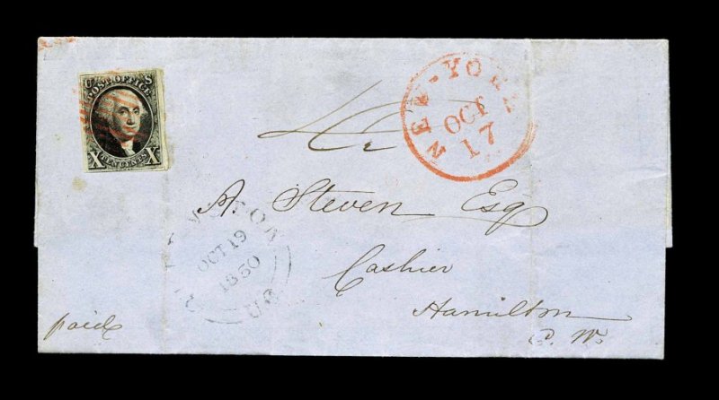 860 c 2 image#2, 10c Black, three large margins, just touching frameline at bottom, strong impression, tied by red grid with matching New York c.d.s. on 1850 folded entire to Hamilton, Canada West, "Queenston U.C./Oct 19 1850" transit pmk., stamp with tiny tear in bottom right margin, otherwise nearly very fine; clear 1981 PF certificate. (Image) 2,100.00