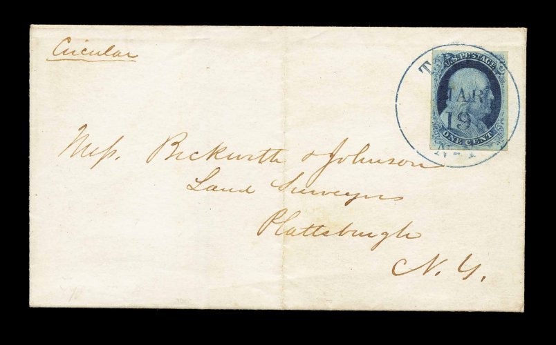 861 c 8A image#8A, 1c Blue, Ty. IIIa, an extraordinary quality single, with full and uncommonly even margins all around, gorgeous deep rich color, tied to very clean 1852 folded letter to Plattsburgh, N.Y. by superb central strike of a blue "Troy, N.Y./Mar 19" c.d.s., manuscript "Circular" notation at top left, an extremely fine and eye-appealing usage of the scarce Type IIIa stamp; 1998 PF certificate; ex-Emerson, "Sevenoaks" Collection, Yost. (Image) Est. 2,000-3,000