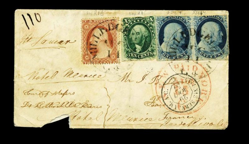 862 c 8A, 13, 26a image#8A, 13, 26a, 1c Blue, Ty. IIIA, horizontal pair, positions 57-58L4, used in combination with a single 10c Green, Ty. I and an 1857 3c Dull red, Ty. IIa, on a small 1857 cover to Paris, France, two strikes of "Milledgeville, Ga./Aug 11" c.d.s. tie stamps, red New York exchange c.d.s. also ties 1c pair, French transit c.d.s. on front, with Paris bkst., the 1c pair and 10c single with margins cutting at points and with other small faults, cover with small piece missing at bottom left, nevertheless a most unusual combination of scarce imperforate 1851 and perforated 1857 issues on a cover to France; 2002 PF certificate; ex-Keech. (Image) Est. 500-750