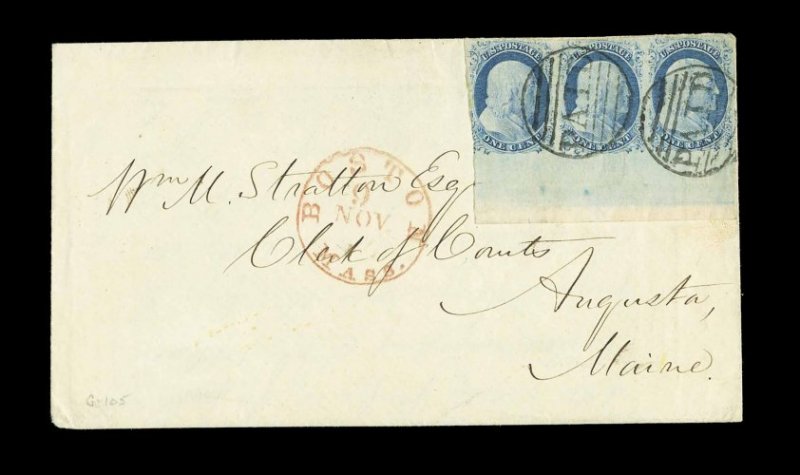 863 c 9 image#9, 1c Blue, Ty. IV, a spectacular bottom sheet-margin horizontal strip of three tied to an especially neat white cover by large Boston "Paid" grids, clear red "Boston, Mass./9 Nov." c.d.s. to left, addressed to Augusta, Maine, strip boasts a gigantic sheet margin at bottom measuring 16mm, other margins full to just in at left, very fine; a visually striking and desirable cover; ex-Krug. (Image) Est. 1,000-1,500