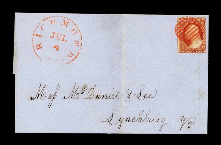 864 c 10 image#10, 3c Orange brown, pos. 83L1, three full margins, tied by orange red grid, with matching "Richmond, Va./Jul 4" cds alongside, 1851 docketing on back, sent to Lynchburg, very fine; used only three days after the first day of issue, from the same correspondence as the unique first day cover from Richmond; accompanied by a letter of authenticity from Dr. Amonette. (Image) Est. 300-400