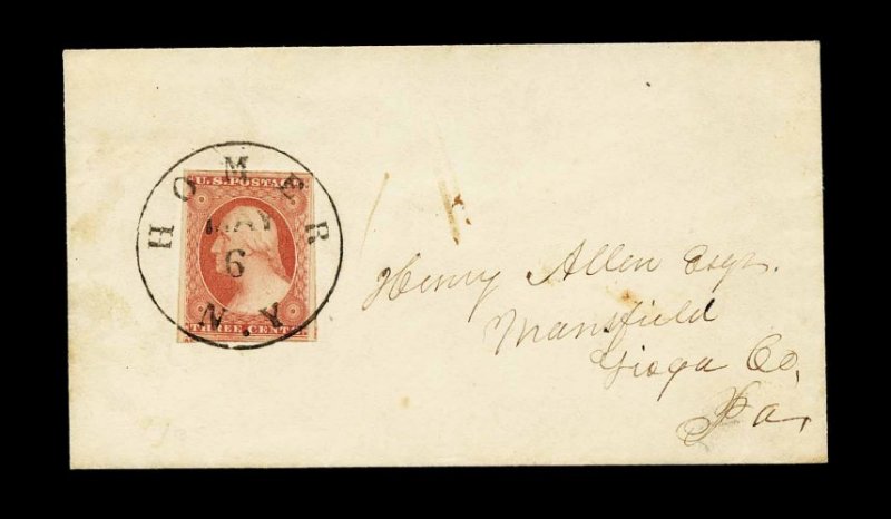 865 c 11 image#11, 3c Dull red, a spectacular single with four huge margins showing portions of the adjoining stamps frame lines on all four sides, beautiful rich color, tied by a sharp and centrally "Homer N.Y. May 6" c.d.s. on petite cover to Pennsylvania, a superb gem. (Image) Est. 150-200