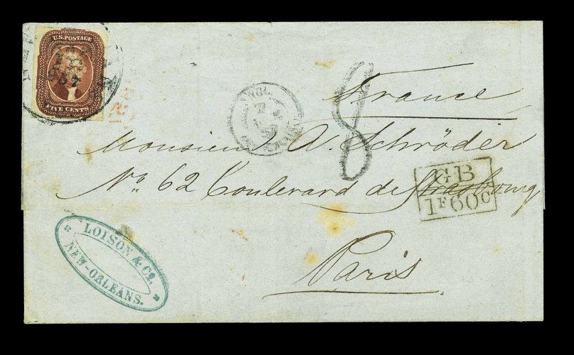 866 c 12 image#12, 5c Red brown, full to mostly large margins, deep intense color and a razor-sharp impression, tied by "New Orleans La./Mar. 16/1857" c.d.s. on folded lettersheet to Paris, France, blue merchant's oval handstamp, boxed "GB/1F60c" handstamp, ms. "8", Boston, British and French backstamps, a few trivial age spots on cover, very fine; 1988 PF certificate. (Image) 1,850.00