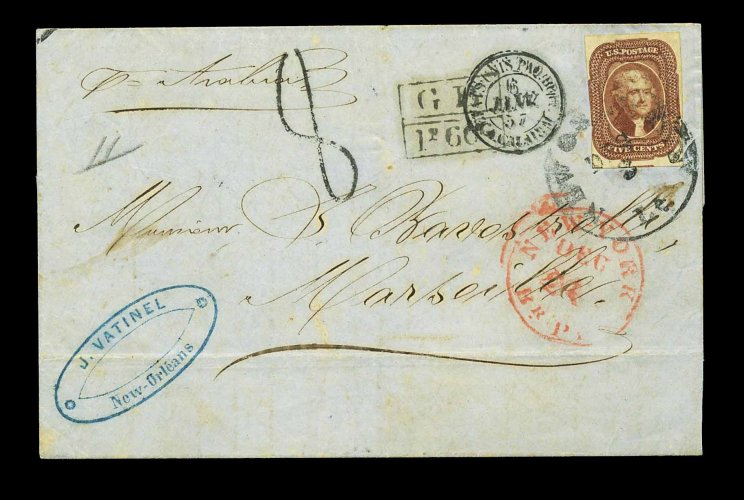 867 c 12 image#12, 5c Red brown, three very large margins, just touching at left, deep luxuriant color, tied to colorful 1857 folded letter to Marseille, France by "New Orleans, La./ Dec. 3" c.d.s., blue merchant's handstamp cachet at bottom left, red New York transit c.d.s., along with a couple of foreign exchange markings, Marseille backstamp, very fine and attractive; 1988 PF certificate. (Image) 1,850.00