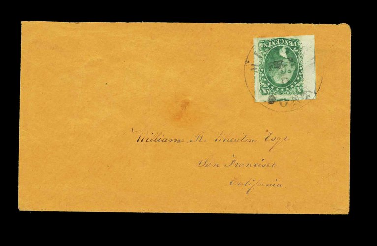 868 c 14 image#14, 10c Green, Ty. II, position 51R1, lavishly large margins all around, including a sizable sheet margin at left showing the guide line, plus a bit of the adjoining stamp at top appears, tied to orange colored cover to San Francisco by light strike of Milford, Conn. c.d.s., extremely fine; a most impressive quality franking; signed Stanley Ashbrook; ex-Haas. (Image) Est. 500-750
