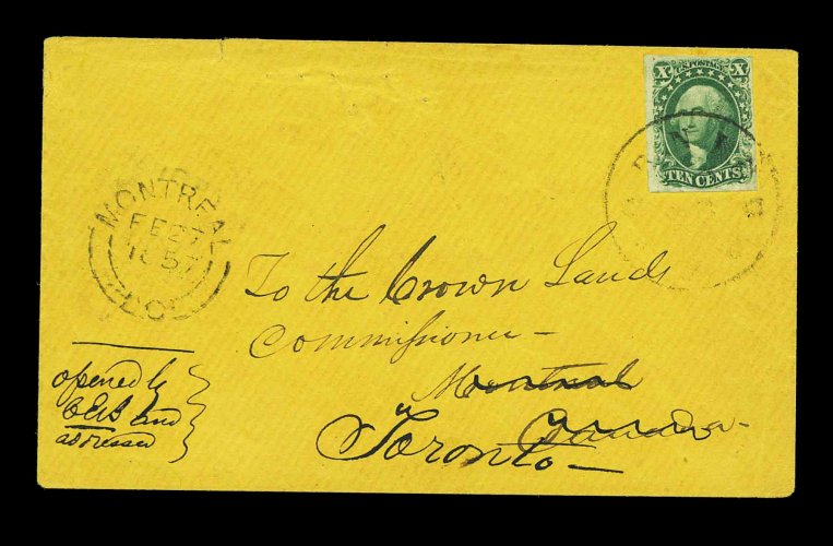 869 c 14 image#14, 10c Green, Ty. II, full to large margins, deep luxuriant color, tied by Corning, N.Y. c.d.s. to 1857 orange cover to Montreal, Canada and then forwarded to Toronto, ms. notation at bottom left "opened by CEB and addressed", Montreal and Toronto backstamps, very fine and handsome; 1978 PF certificate. (Image) Est. 300-400