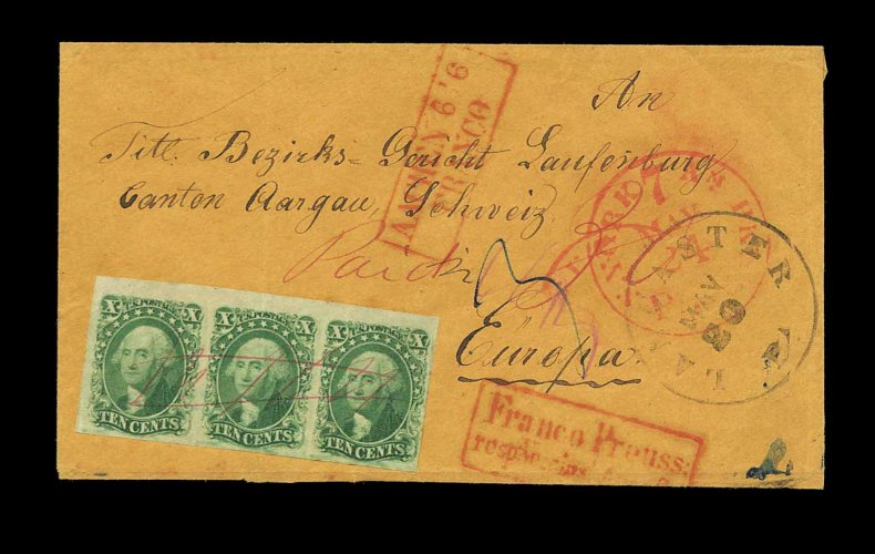 870 c 14 image#14, 10c Green, Ty. II, top sheet-margin horizontal strip of three, large margins to full at right, bright fresh color, postmarked by neat red pen cancels and matching ms. "Paid 30" on buff colored cover to Laufenburg, Switzerland, clear "Lancaster, Pa./May 20" c.d.s., red New York and German transit cancels, backstamped, vertical filing crease barely affects center stamp in strip, otherwise a very fine and tremendously colorful usage; 1989 Jakubek certificate. (Image) Est. 750-1,000