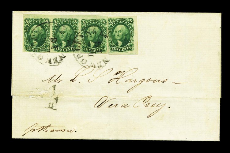 871 c 14, 14, 16 image#14, 14, 16, 10c Green, Types II-II-IV, positions 1-3R1, a magnificent horizontal combination strip of three, with the right stamp being the rare Ty. IV, used along with a Ty. II corner sheet margin single, all lightly tied by "New Orleans, La./Dec. 16" c.d.s. to 1856 folded entire to Vera Cruz, Mexico, from the Hargous correspondence, "4" reales internal due handstamp, all stamps with gorgeous intense color, the strip has a partial sheet margin at top and mostly large margins elsewhere, minor flaws to entire near file fold at left of little consequence, extremely fine; an extraordinarily rare combination strip containing position 3R1, the only recut position in the right pane, used on a most attractive quadruple rate cover to Mexico; ex-Grunin and Zoellner. (Image) Est. 5,000-7,500