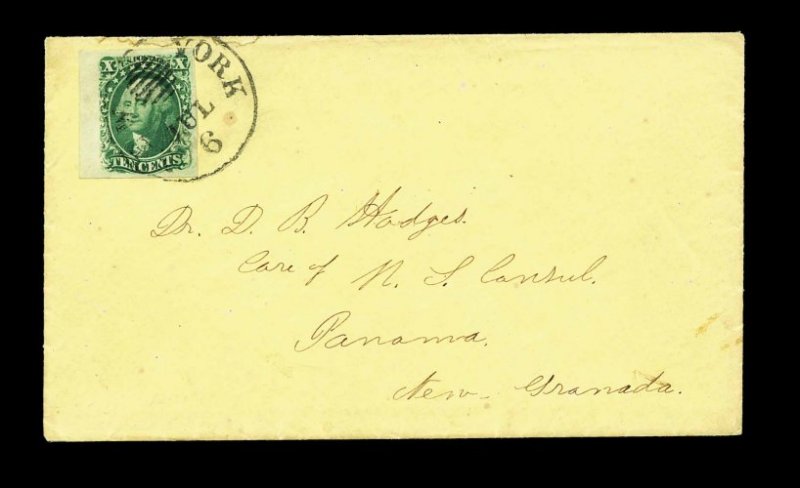 872 c 15 image#15, 10c Green, Ty. III, gem left sheet-margin example, possessing enormously large margins all around, with sumptuously rich color, superbly tied to canary colored cover to Panama, New Granada by scarce "New York/Jul 6" ocean mail c.d.s., accompanied by original 1857 letter enclosure from a wife to her husband regarding news about the Dakota territory, flap tear extends just over edge of cover above stamp, overall an extremely fine and remarkable cover; ex-"Argentum" Collection. (Image) Est. 750-1,000