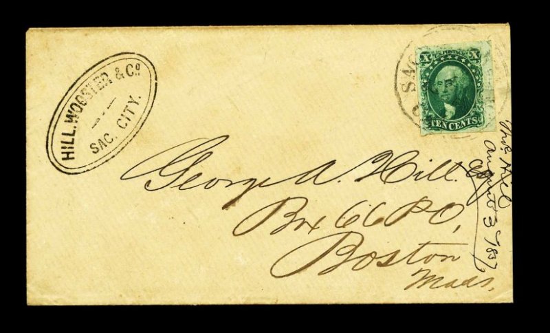 873 c 15 image#15, 10c Green, Ty. III, four large to mostly huge margins, including a sheet margin at right, incredibly deep color, tied by central strike of Sacramento, Cal. c.d.s. on cover to Boston, choice strike of oval "Hill, Wooster & Co./Sac. City" merchant's handstamp at top left, extremely fine; a wonderfully choice stamp on a most attractive transcontinental cover; ex-"Argentum" Collection. (Image) Est. 750-1,000