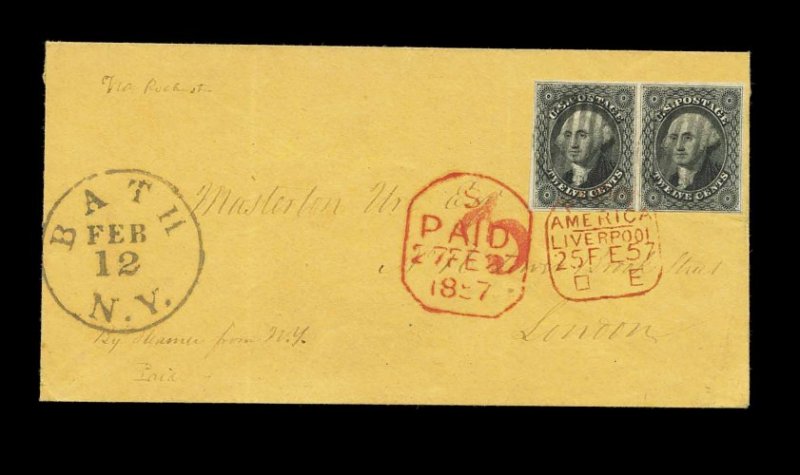 874 c 17 image#17, 12c Black, horizontal pair, wonderfully well margined all around (just a bit closer at bottom right), excellent color and impression, tied to lovely small buff colored cover to London, England, pair with light black grid postmarks and actually tied by red "America/Liverpool" tombstone dated Feb. 25, 1857, red "3" handstamp and London arrival marking just to left, originating "Bath, N.Y./Feb 12" c.d.s. clearly struck at left, extremely fine; an immaculate and colorful cover; signed and annotated by Stanley Ashbrook and accompanied by a 1971 PF certificate; ex-Waud. (Image) Est. 750-1,000
