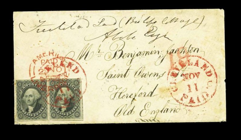 875 c 17 image#17, 12c Black, horizontal pair, margins ranging from just touching to large, tied to 1857 cover to Hereford, England by vivid red "Cleveland O./Nov. 11/Paid" c.d.s., additional strike to right, pair also tied by red "America/Liverpool" transit c.d.s., red "19" rate handstamp, Hereford backstamp, very fine and colorful; 1978 PF certificate. (Image) Est. 500-750