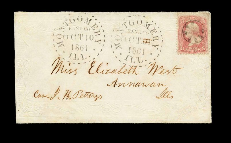 876 c 64 image#64, 3c Pink, cancelled by stenciled circular geometric pmk. (S-E #GE-C80) on cover, with matching "Montgomery Ill/Kane Co/Oct. 10/1861" large pmk., the postmark was originally struck at right with an inverted date, the "01" crossed out and the proper pmk. applied to the left, cover neatly repaired, very fine appearance; a most interesting usage; 1988 PF certificate. (Image) Est. 400-500