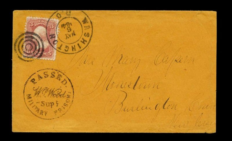 877 c 65 image#65, 3c Rose, tied by Washington, D.C. pmk. on prisoner of war cover from Old Capitol Prison, crisp strike of "Passed/Military Prison" circular handstamp, sent to New Jersey, a little reduced at right, fine. (Image) Est. 200-300
