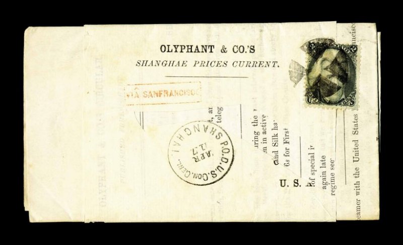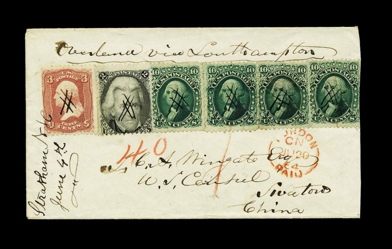 880 c 73 image#73, 2c Black, along with 3c Rose (#65) and four 10c Green (#68) on 1866 cover to Swatow, China, stamps with ms. cancels, Stratham, N.H. pmk. at left, red Boston Paid and London Paid, ms. crayon ties two 10c stamps, Hong Kong and Swatow backstamps, slightly reduced at right, a fine and rare usage. (Image) Est. 500-750