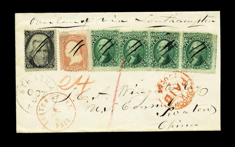 879 c 73 image#73, 2c Black, along with 3c Rose (#65) and four 10c Green (#68) on 1864 cover to Swatow, China, stamps with ms. cancels, Stratham, N.H. ms. pmk. at left also ties 3c, red Boston Paid backstamp, red London Paid, blue Hong Kong receiver, two 10c stamps with faults, slightly reduced at right, fresh and fine. (Image) Est. 500-750