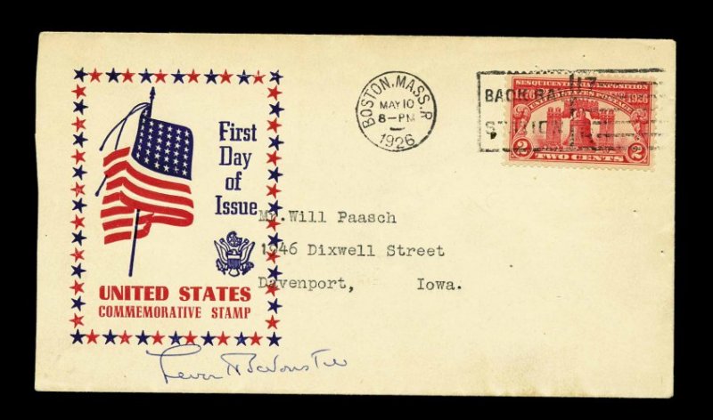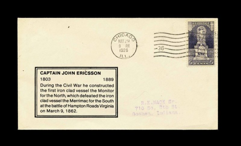 1000 F 628 image#628, 5c Ericsson, tied to first day cover by "Chicago Ill./May 29/1926" machine cancel, with unlisted Mack cachet of text in double border box, very fine and reportedly unique. (Image) Est. 150-200