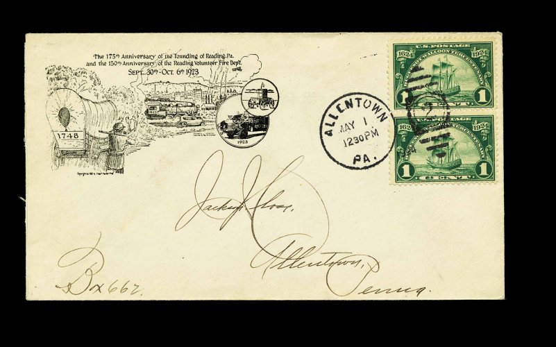 981 F 614 image#614, 1c Huguenot-Walloon, vertical pair tied to first day cover by "Allentown Pa/May 1/1924" duplex handstamp, with elaborate cachet commemorating the 175th Anniversary of Reading (Planty #6), neatly opened at left, very fine; a very rare cachet, with only a few examples known. (Image) Est. 200-300