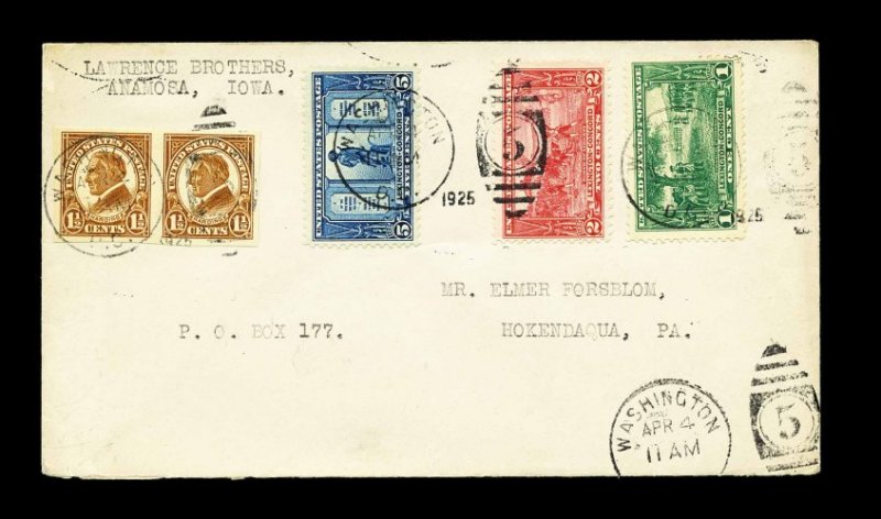 982 F 617-19 image#617-19, 1c-5c Lexington-Concord cplt., tied to first day cover along with 1 1/2c Harding imperf. pair (#576) by "Washington, D.C./Apr 4/1925" duplex handstamps, all four stamps issued on the same day, neatly opened at bottom, very fine; a rare combination first day cover. (Image) Est. 400-500