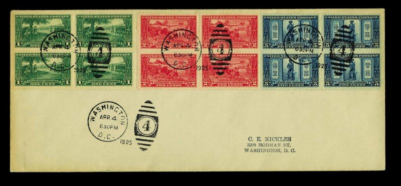983 F 617-19 image#617-19, 1c-5c Lexington-Concord cplt., blocks of four tied to one long first day cover by "Washington D.C./Apr 4/1925" duplex pmks., addressed to Nickles, very fine; reportedly the only know example of a set of blocks on a Nickles first day cover. (Image) Mellone 250.00