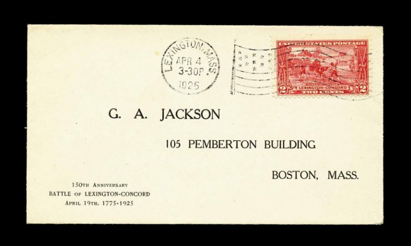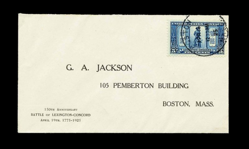 987 F 619 image#619, 5c Lexington-Concord, tied to pristine first day cover by "Boston, Mass/Apr 4/25" c.d.s, with the first Guy Atwood Jackson cachet printed directly on the envelope in the lower right corner (unlike all other 5c values which have the cut-out label attached), neatly opened at top, extremely fine; unique with the printed cachet. (Image) Est. 500-750
