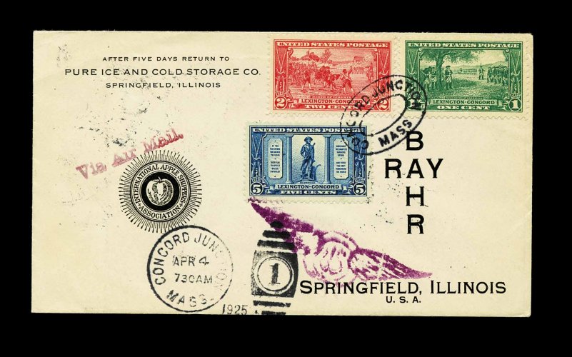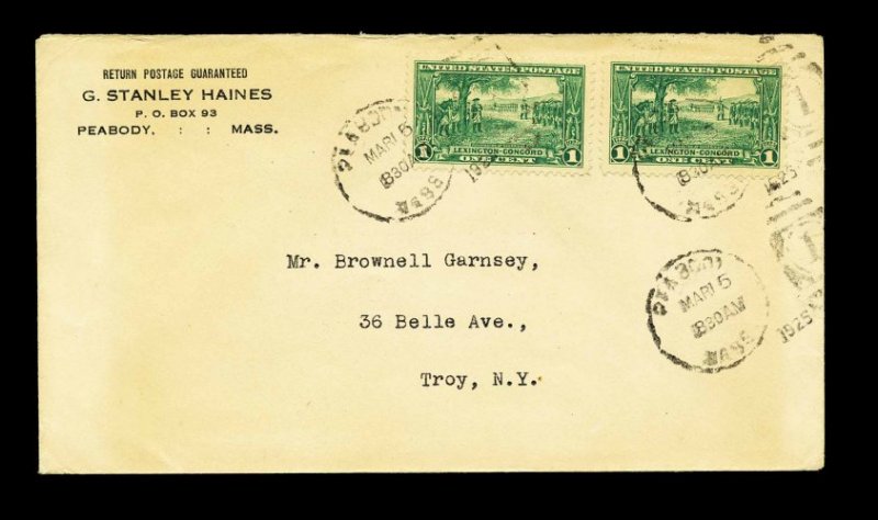 985 c 617 image#617, 1c Lexington-Concord, tied to cover by "Peabody, Mass/Mar 15/1925" duplex handstamps, predating the official first day of April 4, cover with just a faint hint of toning, still very fine; only a handful of predates of the Lexington-Concord issue are known. (Image) Est. 300-400