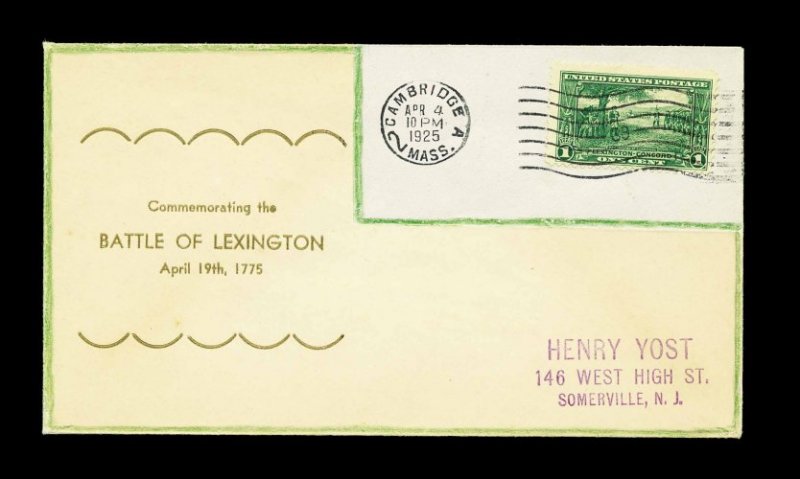 986 F 617 image#617, 1c Lexington-Concord, tied to first day cover by "Cambridge Mass./Apr 4/1925" machine cancel, with unlisted Henry Yost cachet outlined in green crayon, very fine; probably unique. (Image) Est. 150-200