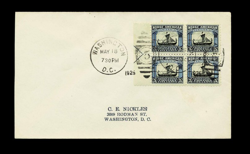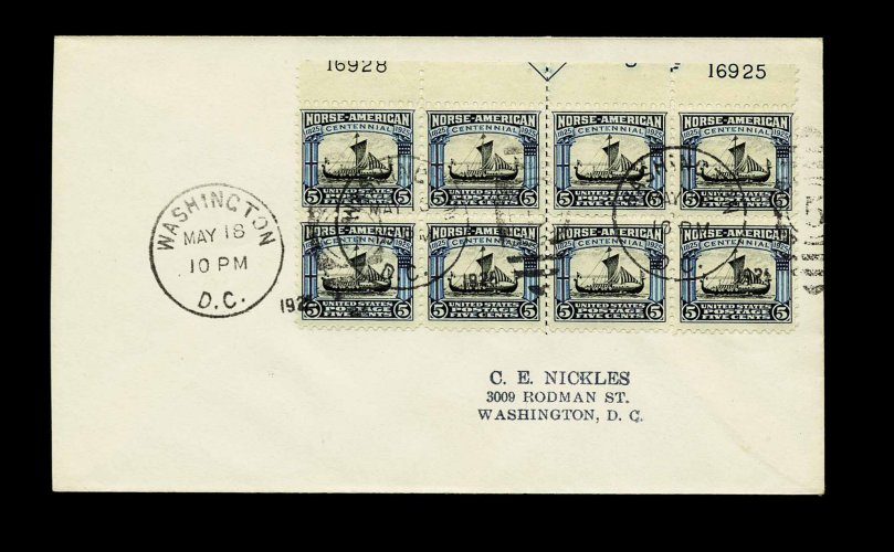 990 F 620-21 image#620-621, 2c-5c Norse American cplt., top margin arrow and plate no. blocks of each tied to separate Nickles addressed first day covers by "Washington D.C./May 18/1925" duplex pmks., very clean and extremely fine; immensely rare (if not unique) set with plate blocks. (Image) Est. 750-1,000