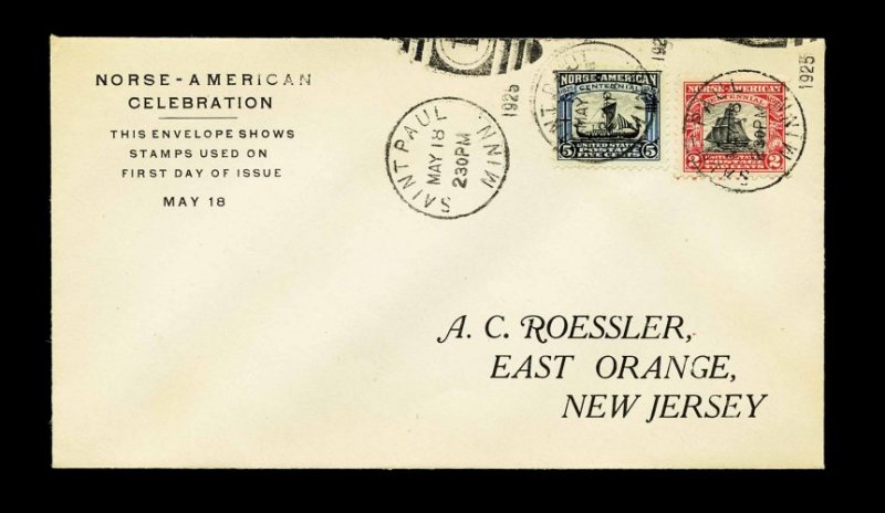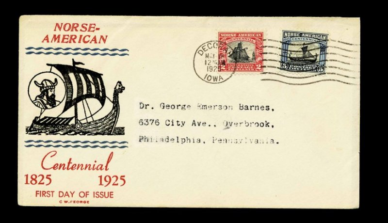992 F 620-21 image#620-621, 2c-5c Norse American cplt., tied to a first day cover by "Decorah Iowa/May 18/1925" machine cancel, with first C.W. George cachet (Planty #2), very fine and attractive. (Image) Est. 150-200